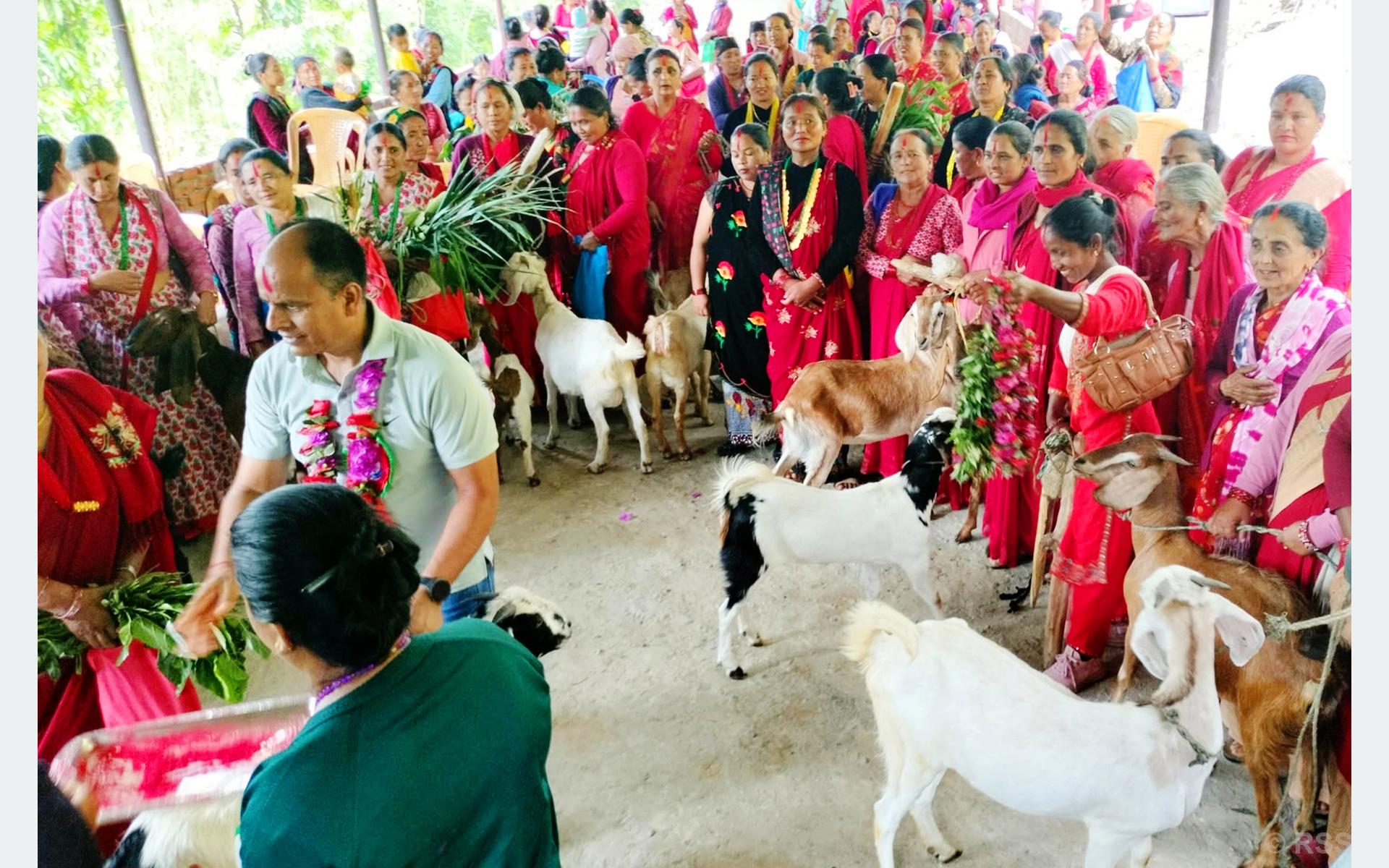 This week, 50 goats were distributed to members of the Sangharshashil, Sayapatri, Suseli, Lagansheel, Suryamukhi, and Shubhalakshmi women’s groups under the Sangarshashil, Shubhalakshmi, and Entrepreneurs Self-reliant Women’s Group in Kathekhola-7 Reshma. The recipients expressed happiness and gratitude for the support.