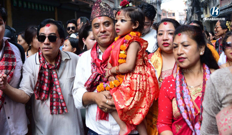 From the Kumari Ghar at Basantapur, she was carried in a ceremonial procession that also included the deities Bhairav and Ganesh. The ritual was conducted by a tantric priest, who escorted the young goddess inside the Taleju temple, said Gautam Shakya, coordinator of the Kumari Ghar Management Committee.