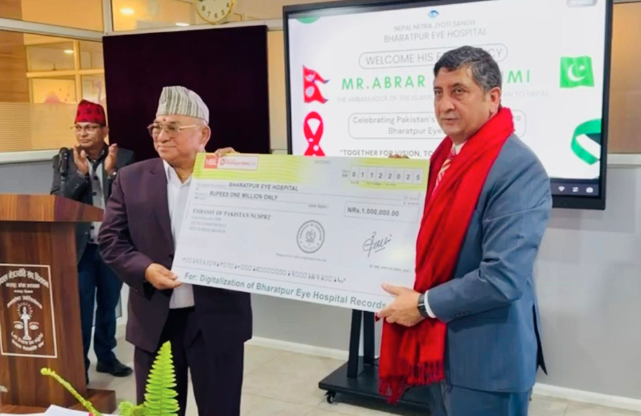 KATHMANDU: Pakistan’s Ambassador to Nepal, Abrar H. Hashmi, handed over a cheque in support of the paperless digitization of the Bharatpur Eye Hospital (BEH) in Bharatpur, as a gift from the People of Pakistan.
