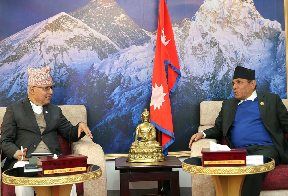 According to the National Assembly Secretariat, both ministers met with the chair in his office at Singha Durbar to discuss a range of contemporary issues, including the construction of the National Assembly chamber, upcoming elections, and coordination and cooperation between the government and the parliament.