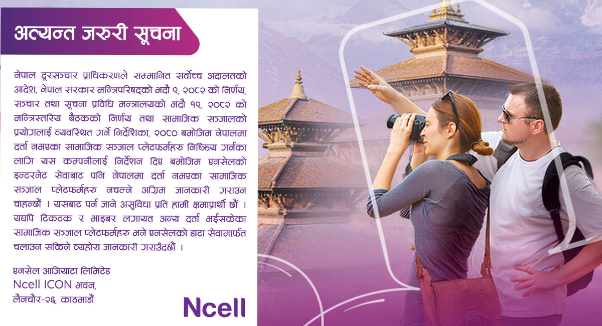 In a press release issued Thursday, Ncell stated that it would comply with the directives of the Nepal Telecommunications Authority (NTA). The authority’s instructions were based on the Supreme Court’s order, the Cabinet decision of August 25, the Ministry of Communication’s directive on September 4, and the “Guidelines for Regulating the Use of Social Media, 2080.”