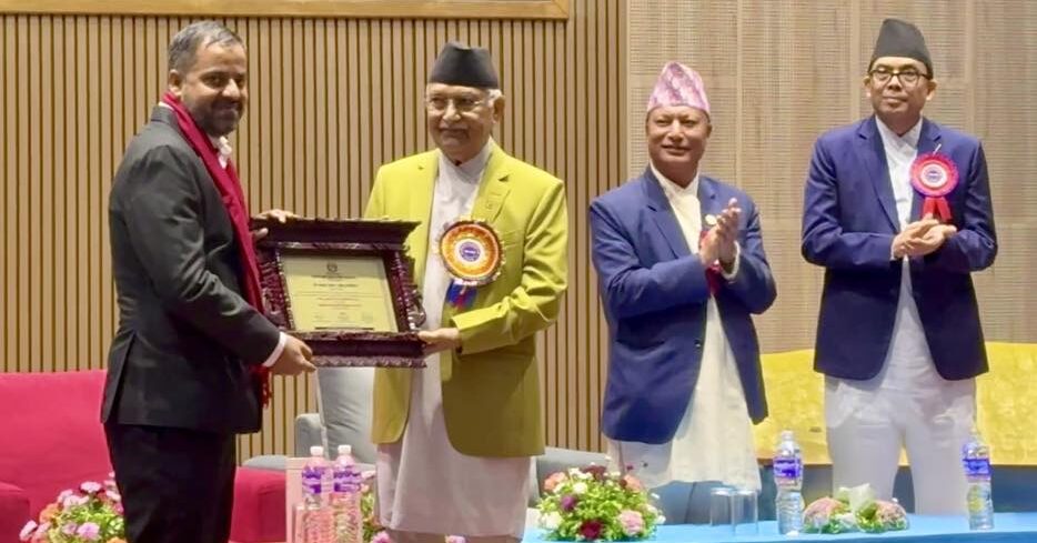 On the occasion of the 8th National ICT Day, Prime Minister KP Oli presented a certificate of appreciation to FonePay CEO Diwas Kumar at a ceremony held in Kathmandu.