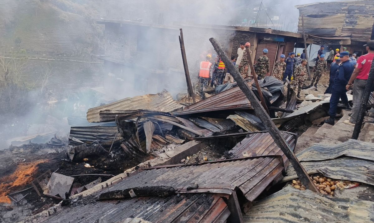BAJURA: A fire swept through Bamka Bazaar in Budhiganga Municipality-6 on Friday afternoon, reducing at least 30 shops to ashes and causing damages worth millions of rupees.