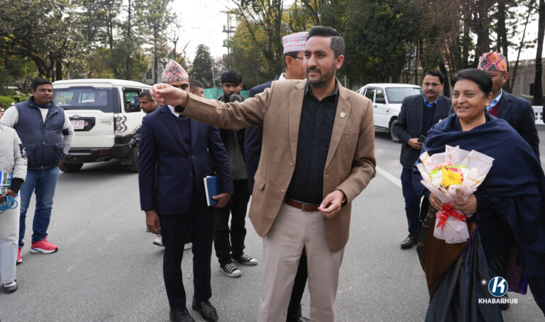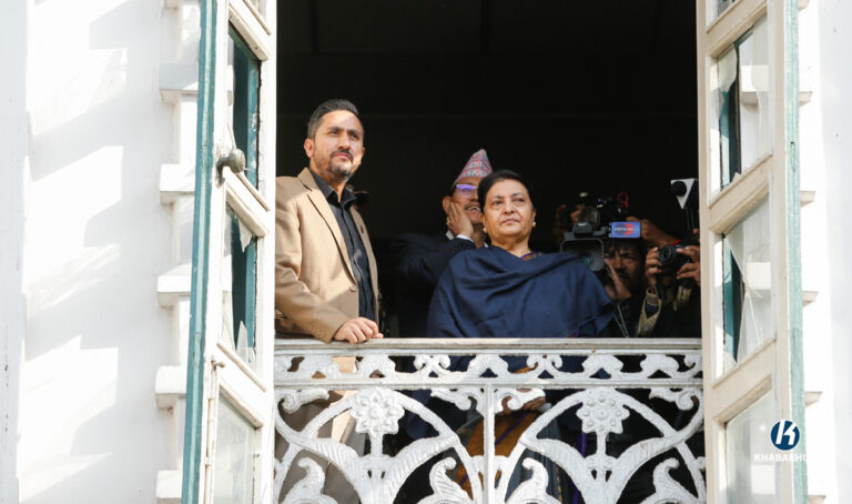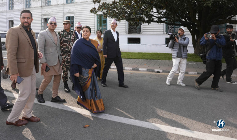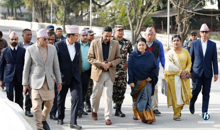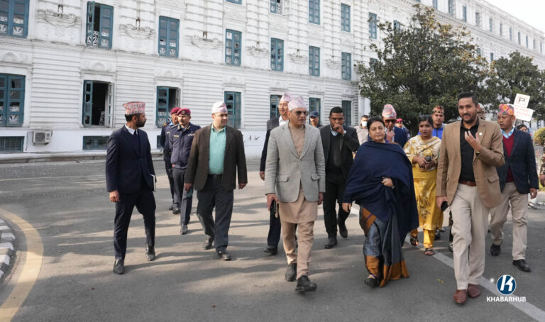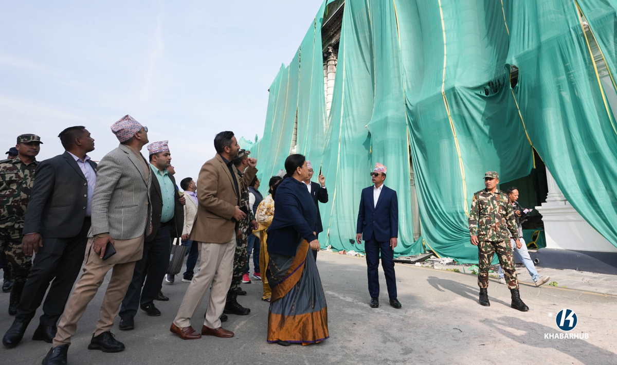 She visited Singha Durbar at around 2:00 PM on Sunday and observed the damaged structures. The western section of Singha Durbar was completely damaged due to arson during the Gen-Z movement that took place on September 8 and 9.
