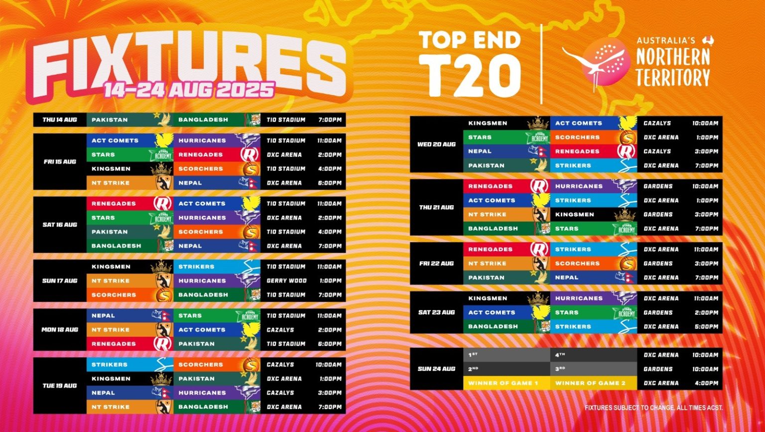 Additionally, five academy teams from Australia’s Big Bash League will participate: Hobart Hurricanes, Perth Scorchers, Adelaide Strikers, Melbourne Stars, Melbourne Renegades, as well as the ACT Comets and the local NT Strike team.