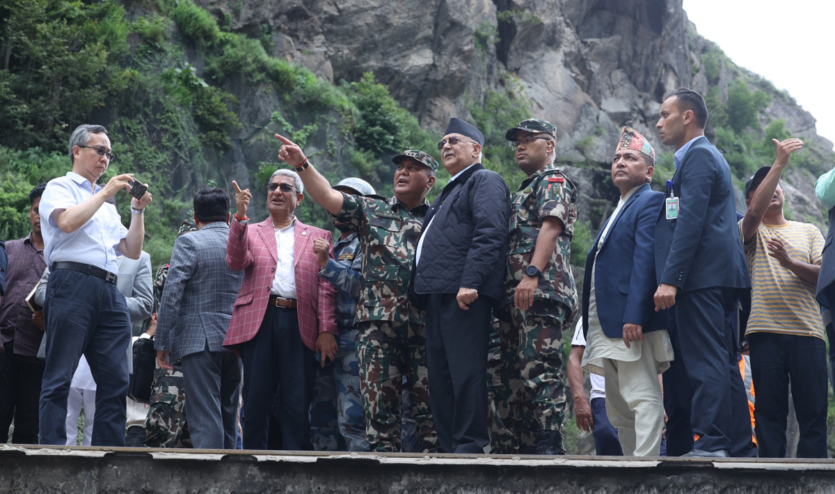KATHMANDU: Prime Minister KP Sharma Oli, along with Chinese Ambassador Chen Song and other officials, reached the Rasuwagadhi border point to inspect the damage caused by a massive flood in the Bhotekoshi River.