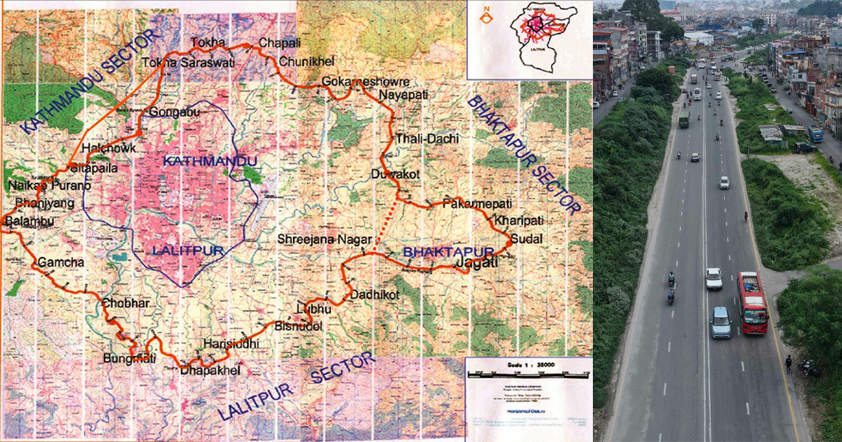 A 72-kilometer, eight-lane Outer Ring Road has been proposed to encircle the Kathmandu Valley, covering all three districts: Kathmandu, Bhaktapur, and Lalitpur. Of the total length, 33.98 kilometers will fall within Kathmandu, 18.612 kilometers in Bhaktapur, and 13.99 kilometers in Lalitpur.