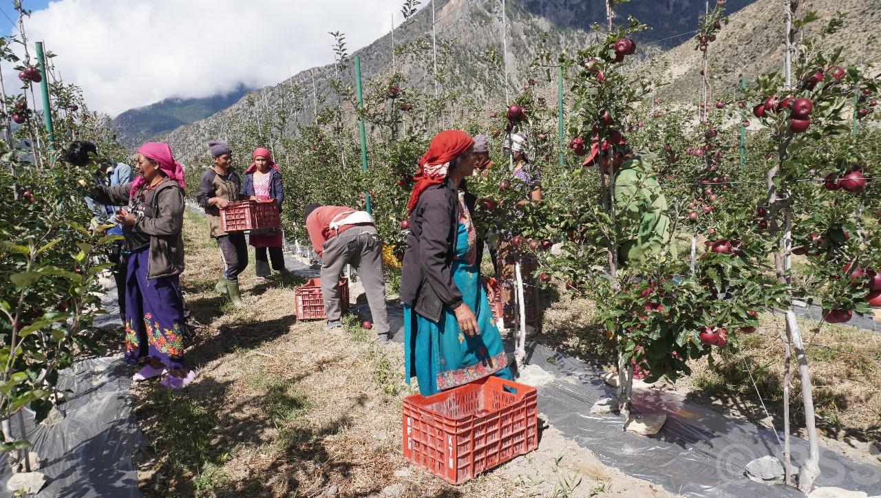 Last year, the district produced a total of 7,328 metric tons of apples—including both local and hybrid varieties—from 616 hectares of orchard land. Of this, 10 percent was consumed locally in Mustang, while 90 percent was exported.