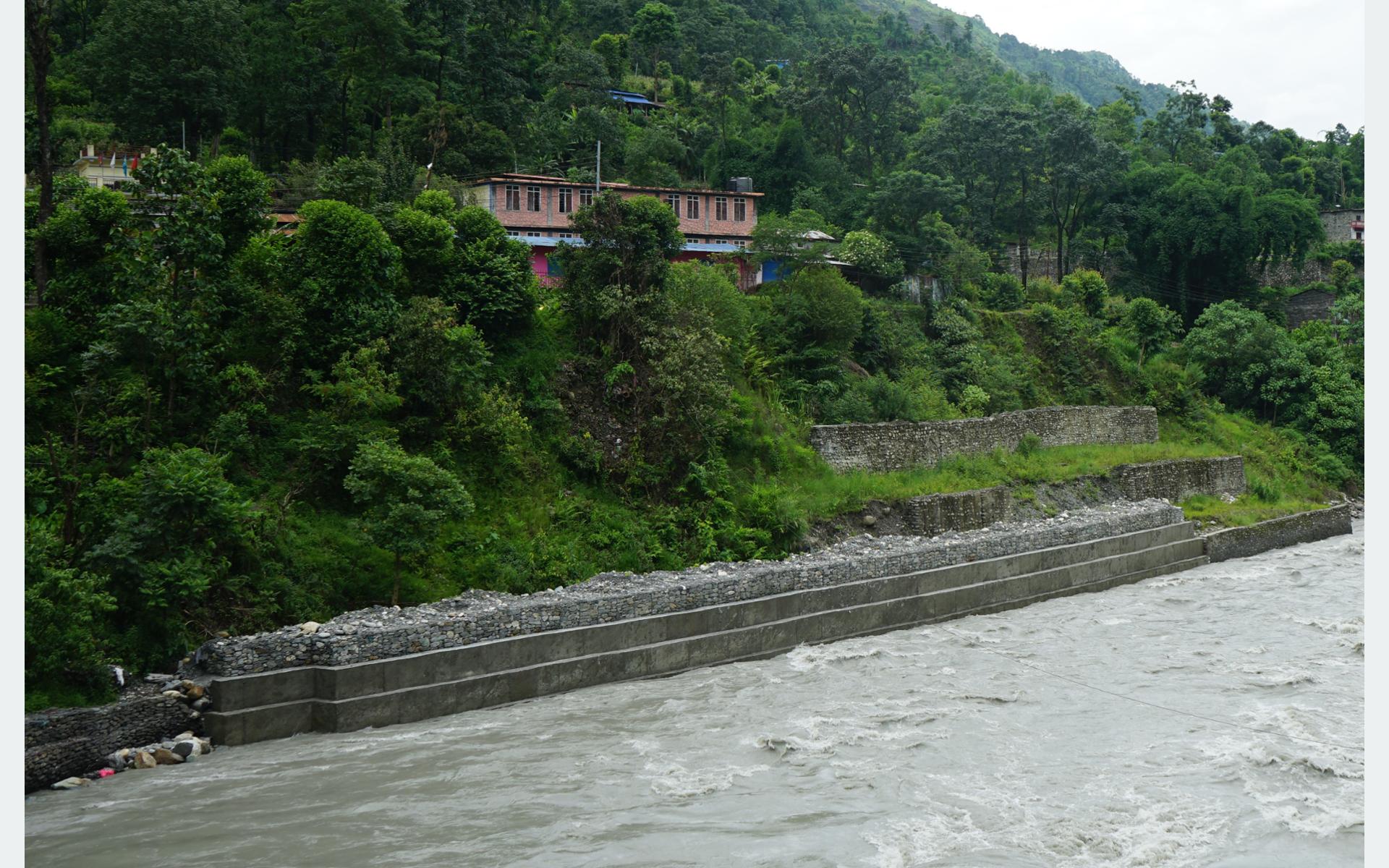 A 66-meter-long, four-meter-wide, three-meter-high concrete embankment with a gabion wall has been constructed on the banks of the Myagdi River behind Saraswati Secondary School in Masar, Singa Tatopani, Beni Municipality-4.