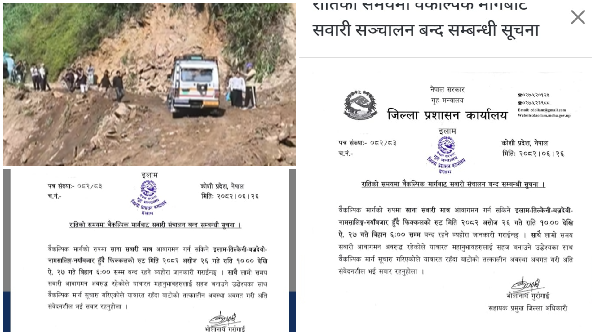 KATHMANDU: The Ilam District Administration Office has announced that vehicles can temporarily use the Ilam–Tilkeni–Banjbedi–Namsaling–Nayabazar–Fikkal road section as an alternative to the Mechi Highway.