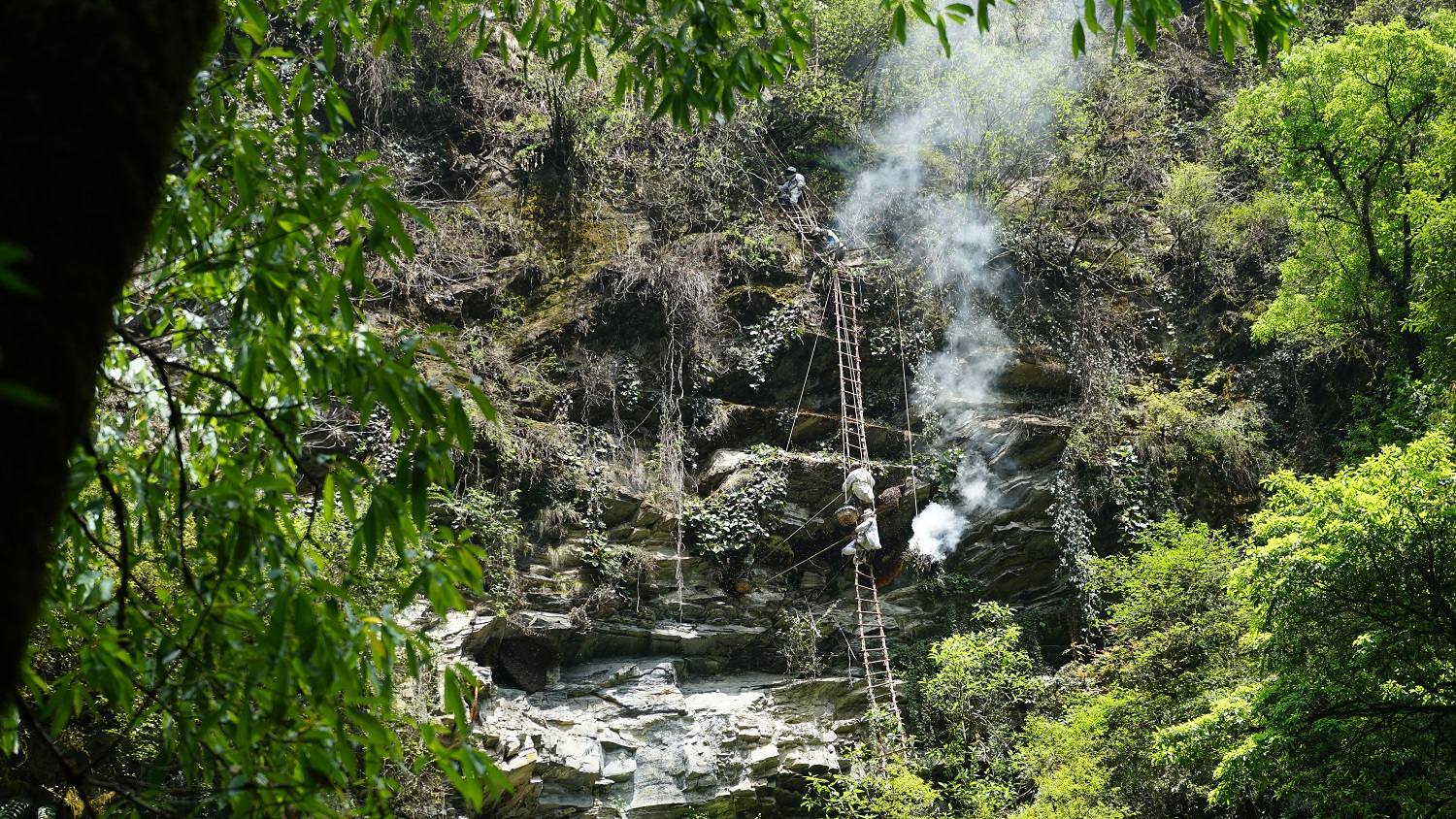 During harvesting, smoke is used to drive away the bees, which cluster around their honeycombs. Once the bees disperse, the lead hunter cuts the comb, and the honey is lowered in containers using ropes. The process requires great caution, as bees become aggressive and hunters often have to hide behind rocks or in caves until it is safe.