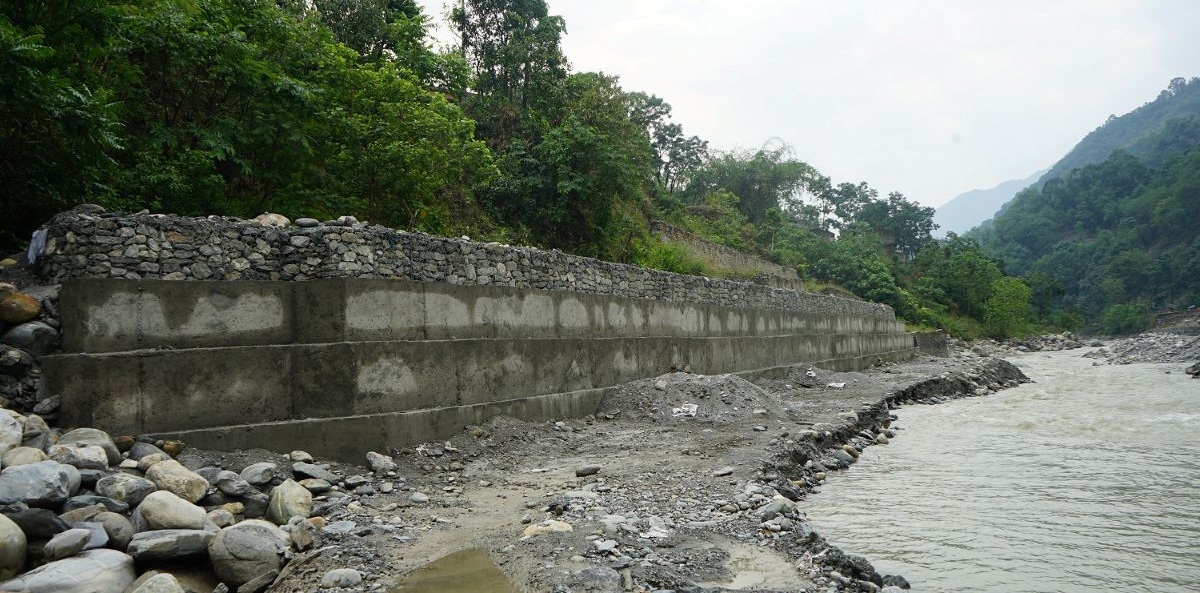According to project engineer Narjung Gurung, a 66-meter-long, four-meter-wide, and three-meter-high concrete wall, with a gabion wall above it, was built to prevent erosion along the riverbank.