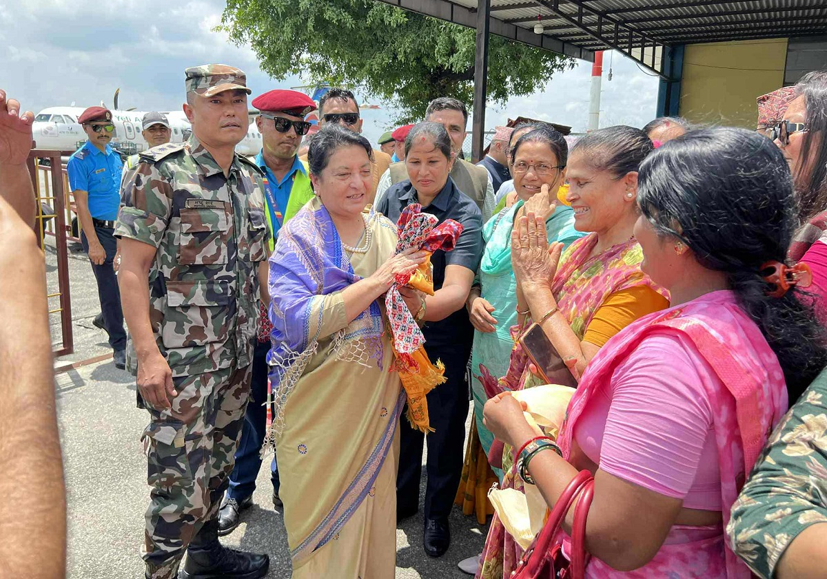 BIRATNAGAR: Former President Bidya Devi Bhandari was warmly received by provincial leaders and cadres of the CPN-UML upon her arrival at Biratnagar Airport on Monday, despite the party’s recent decision to bar her from active involvement in its activities.