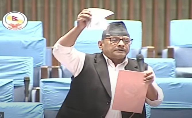 KATHMANDU: Unified Socialist lawmaker Amar Bahadur Thapa tore a copy of the upcoming fiscal year’s budget book during Thursday’s session of the House of Representatives.
