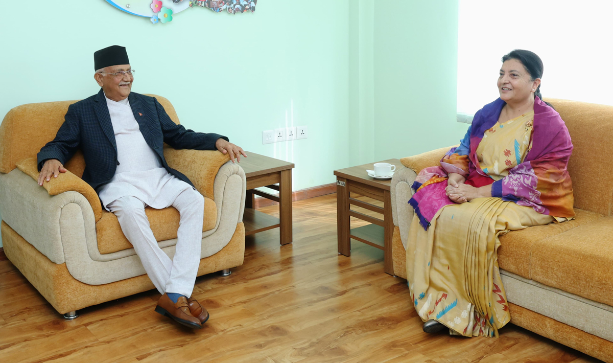 KATHMANDU: Prime Minister and CPN-UML Chair KP Sharma Oli met with former President Bidya Devi Bhandari at the party’s central office in Chyasal on Sunday, amid growing internal disputes within the party.