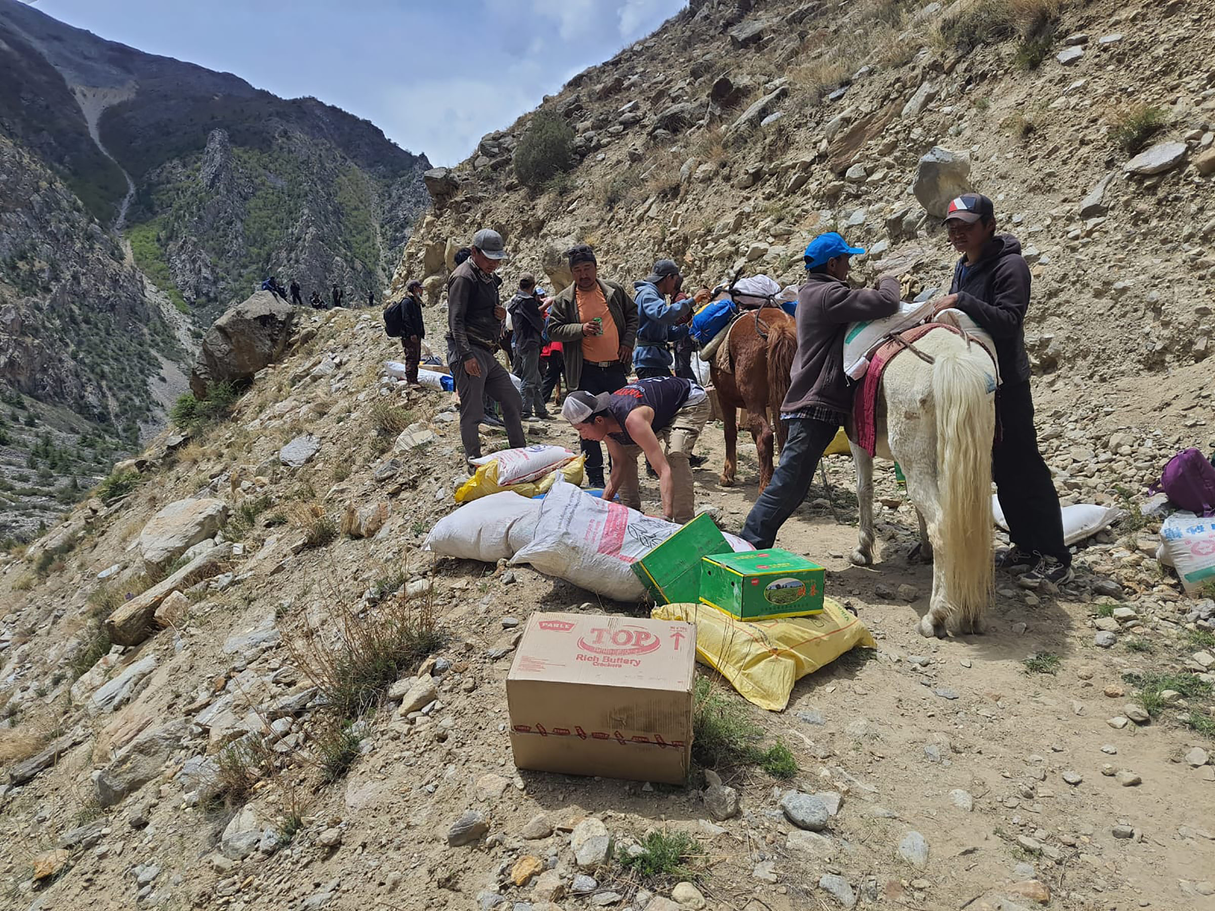 Currently, 33 individuals from the 19 affected households in Til village are living under tarpaulins. The relief materials were transported by vehicle as far as Halji village, and from there, they were carried to Til village by porters, horses, and mules.