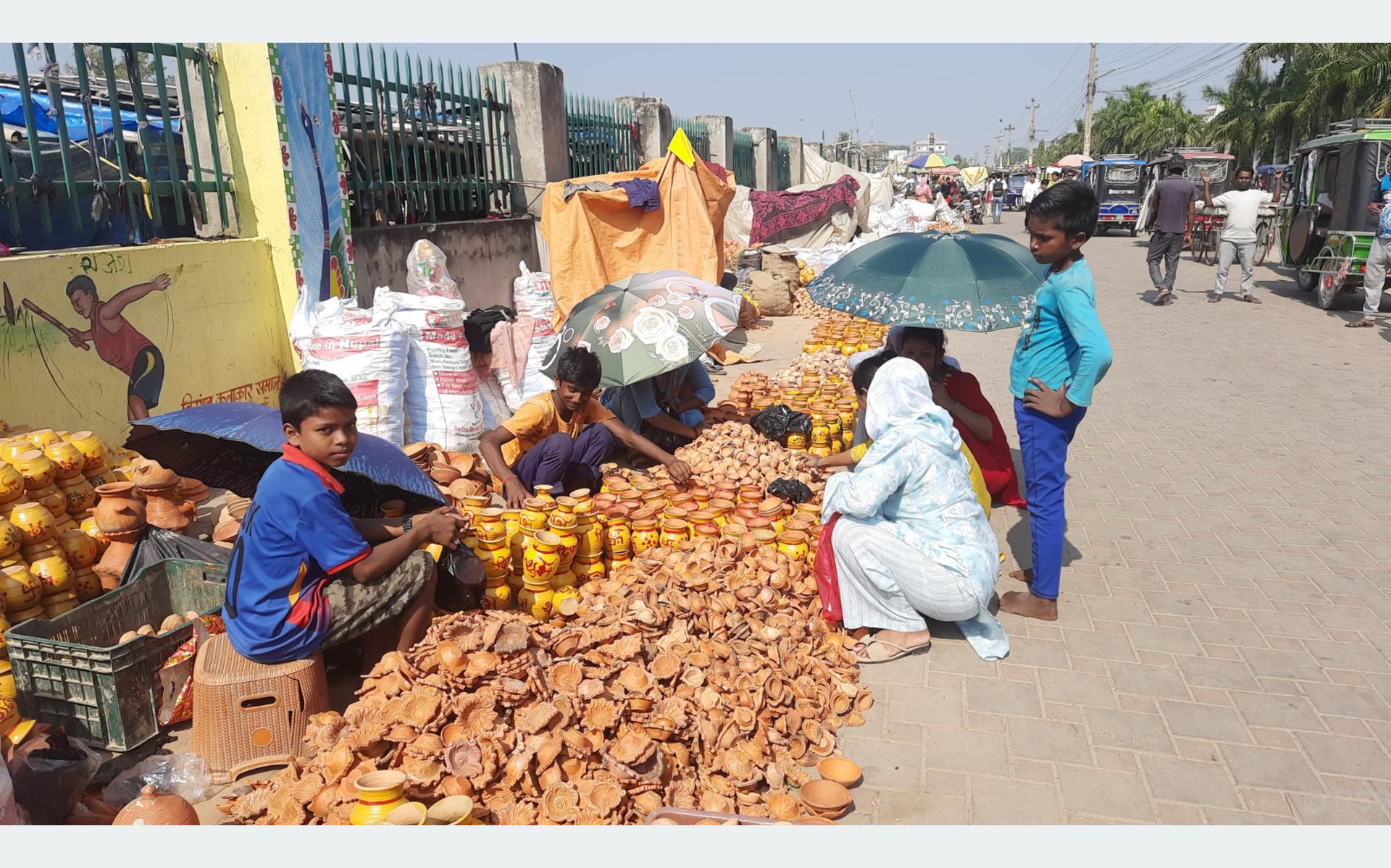 Fourteen-year-old Alok Prajapati of Birgunj Metropolitan City-11, Ranighat, who has been selling earthenware on the footpath near Ghantaghar Chowk for the past three years, said business has been slow compared to previous festive seasons.