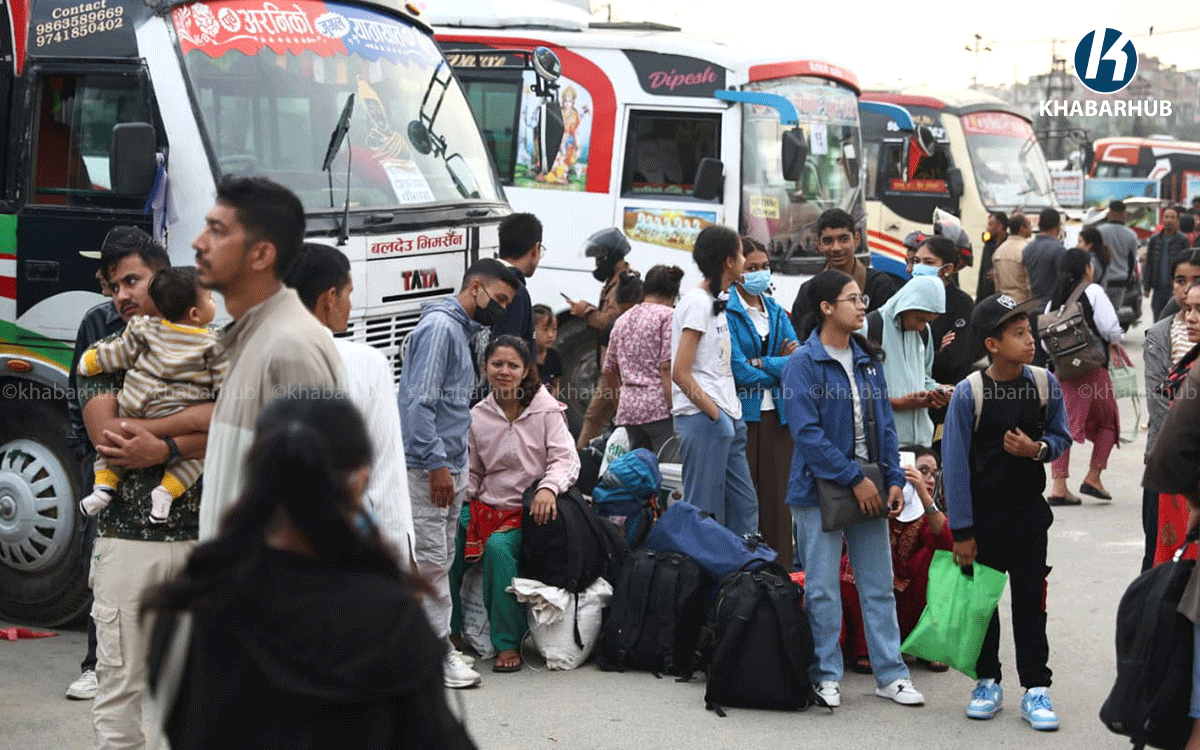 With the festival underway, the annual exodus from Kathmandu toward home districts has begun. Major exit points of the Valley, including Kalanki, Koteshwar, Balaju, Balkhu, and Jorpati, saw heavy traffic since early morning as thousands of people boarded buses to return to their hometowns.