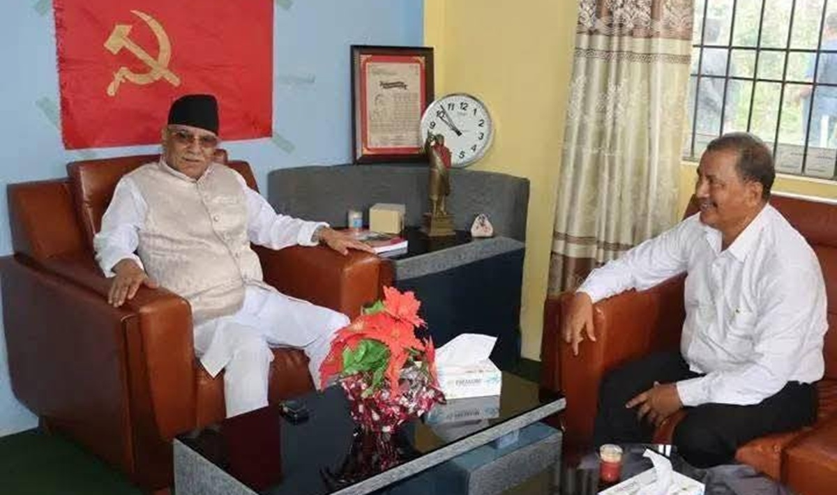 KATHMANDU: CPN (Maoist Centre) Chair Pushpa Kamal Dahal ‘Prachanda’ met with Netra Bikram Chand ‘Biplav,’ General Secretary of the Communist Party of Nepal, in Lalitpur on Monday morning.