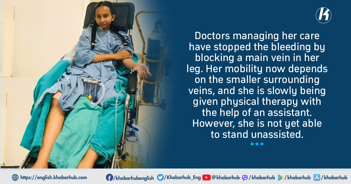 Doctors managing her care have stopped the bleeding by blocking a main vein in her leg. Her mobility now depends on the smaller surrounding veins, and she is slowly being given physical therapy with the help of an assistant. However, she is not yet able to stand unassisted.
