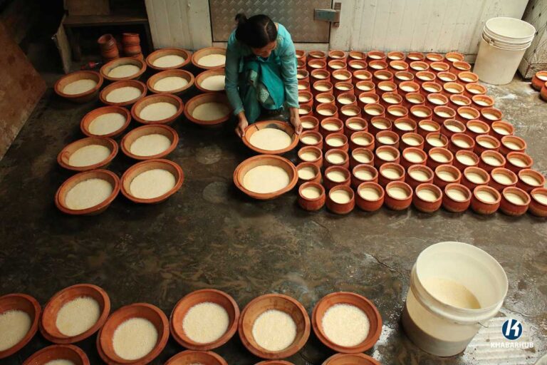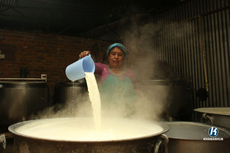 Rina Suwal, operator of SS Juju Dhau in Bhaktapur, along with five others at her production facility, is fully engaged in making large quantities of Juju Dhau.