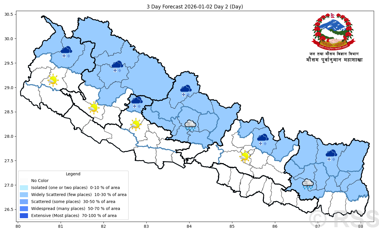Tonight, the hilly and mountainous regions of Koshi, Bagmati, Gandaki and Karnali provinces are expected to remain partly cloudy, while the rest of the country will see mainly clear weather. Light snowfall is likely at one or two places in the high hilly and mountainous areas of Koshi, Bagmati and Gandaki provinces. Fog may also persist in some parts of the Terai.