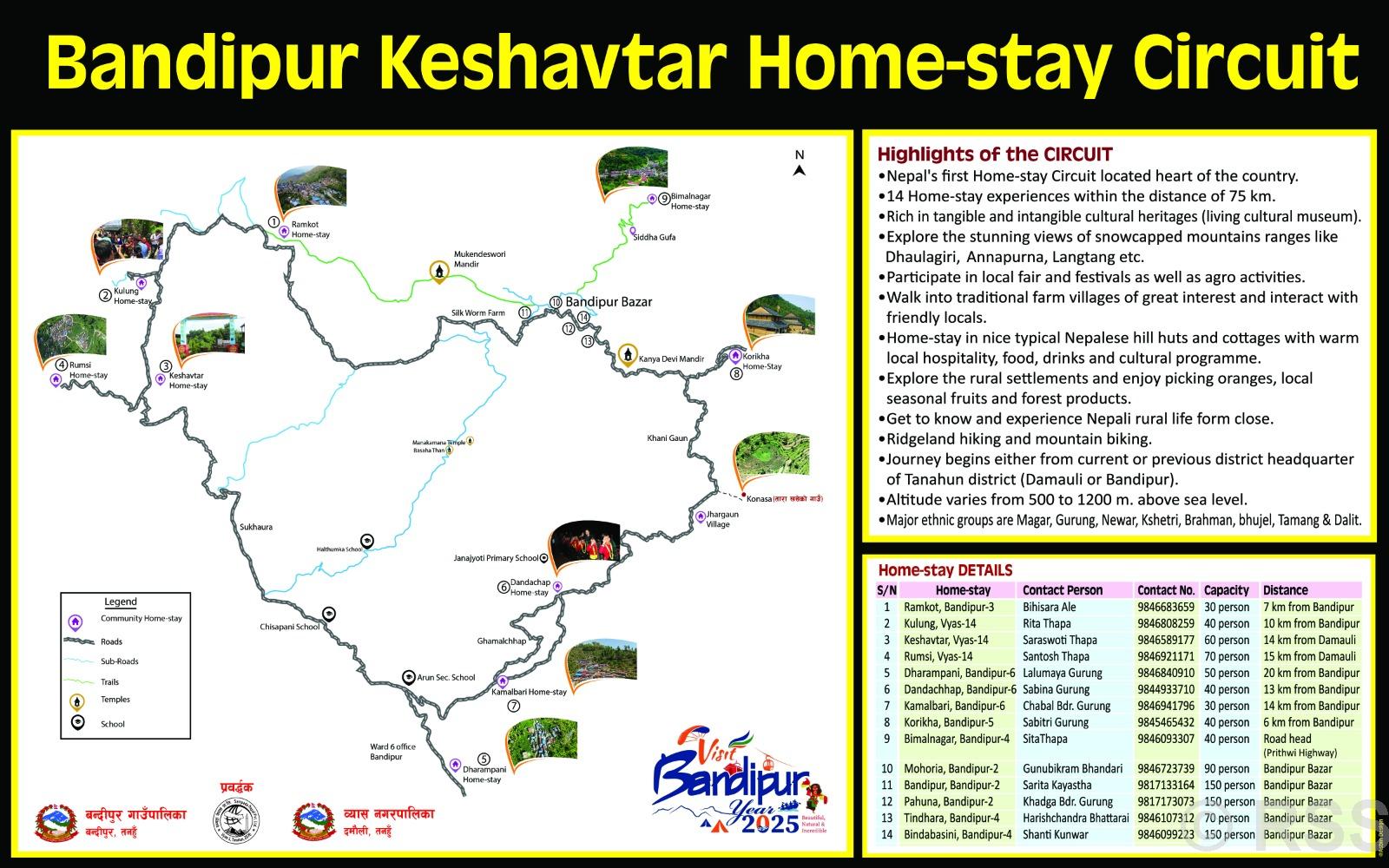 The Bandipur, Pahuna, and Bindabasini settlements can accommodate up to 150 people simultaneously. Along the circuit, visitors can explore religious, cultural, and touristic sites including Jhargaon, Kanyadevi Temple, Manimukundeshwari Temple, and Bandipur Bazaar.