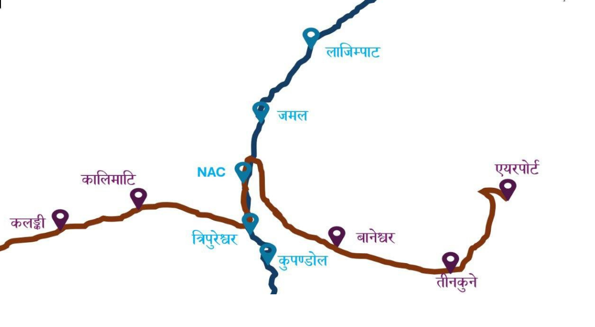 The second route operates from Thankot to Tribhuvan International Airport, passing through Kalanki, Tripureshwar, Thapathali, Maitighar Mandala, Baneshwar, Minbhawan, and Tinkune.