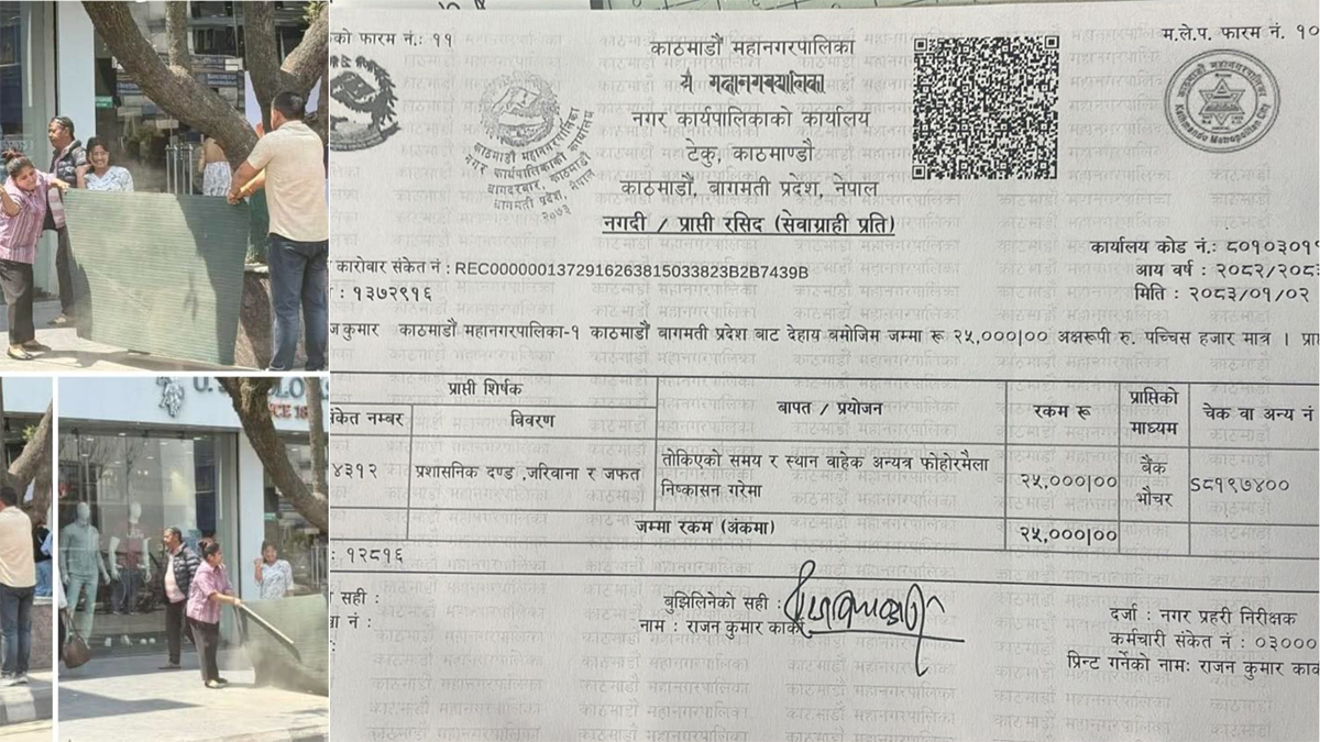 According to the Kathmandu Metropolitan City Police Force, shop owner Pankaj Kumar was fined Rs 25,000 for dumping dust from a mat onto the street pavement.