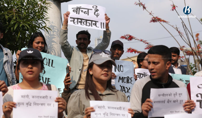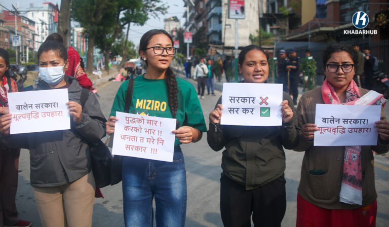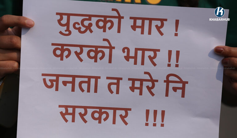 Protesters chanted slogans criticizing the government, including “Let the people live,” “Ministers have comfort while people cannot afford salt,” and “Balen government, price hike as a gift.”