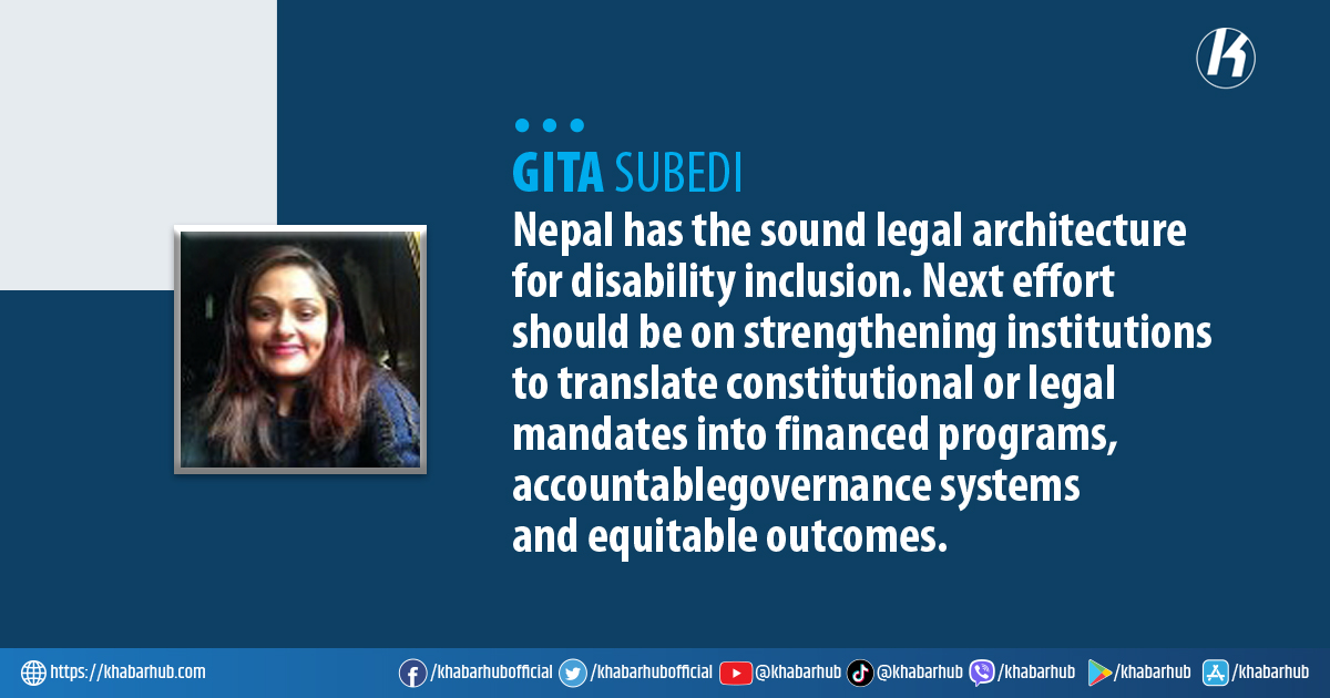 Nepal has the sound legal architecture for disability inclusion. Next effort should be on strengthening institutions to translate constitutional or legal mandates into financed programs, accountable governance systems and equitable outcomes.