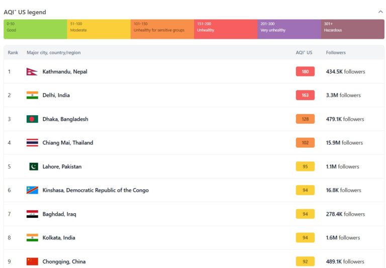 According to the Air Quality Index (AQI), the Valley is currently ranked the first most polluted city in the world as of Sunday, 12 noon. The AQI stands at 180, which falls under the “unhealthy” category. An AQI between 201 and 300 is considered “very unhealthy.”