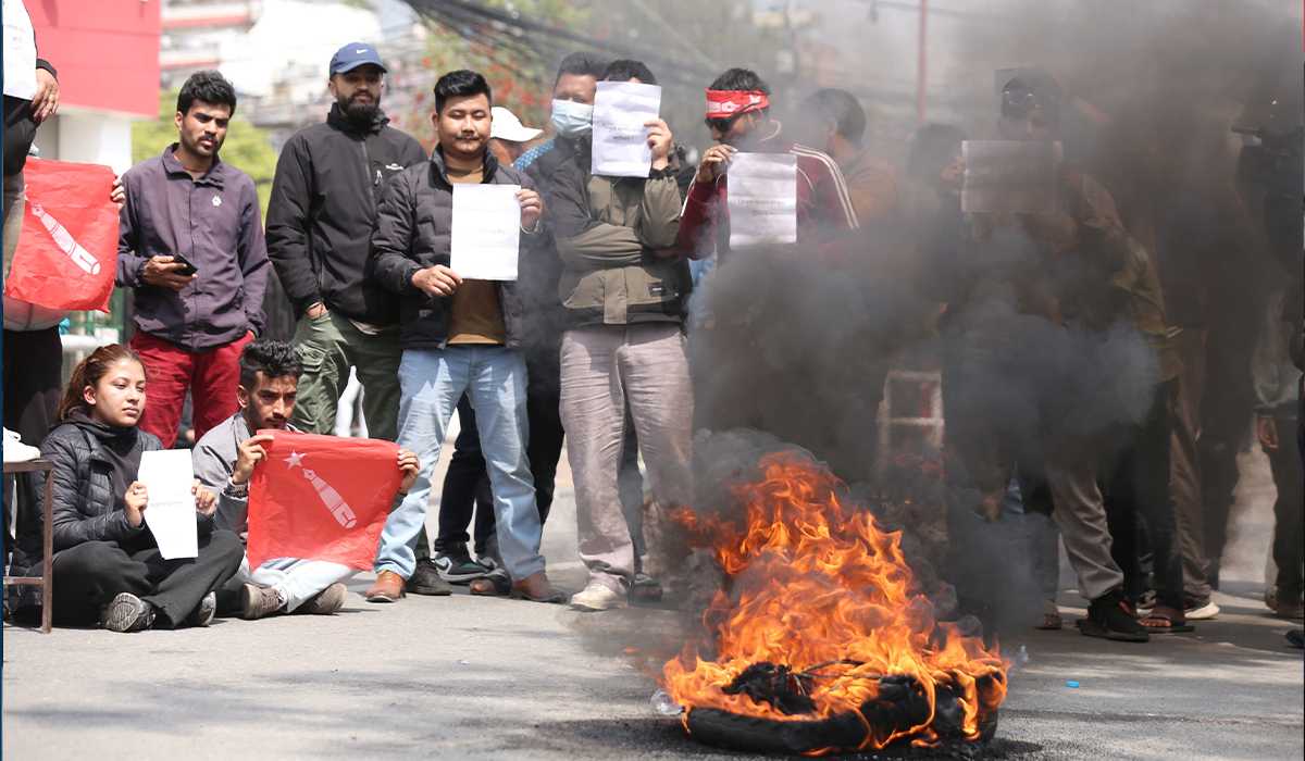KATHMANDU: All Nepal National Free Students Union, the student wing close to the Communist Party of Nepal (Unified Marxist–Leninist), staged a protest by burning tyres at Bhrikutimandap on Saturday.
