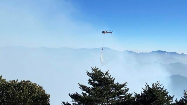 Simrik Air helicopter conducts fire-fighting mission at Pathivara Temple Area