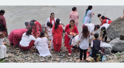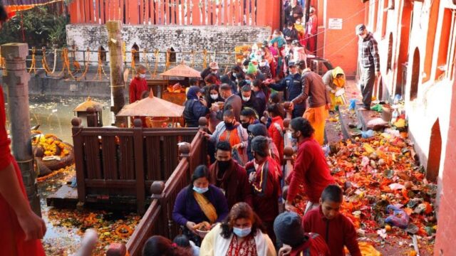 People bathe in the holy Kaligandaki river on Harishayani Ekadashi