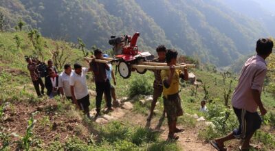 First-ever hand tractor arrives in Chepang settlement, carried for two hours