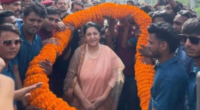 Former President Bhandari welcomed with 51-kg flower garland by UML cadres in Bara