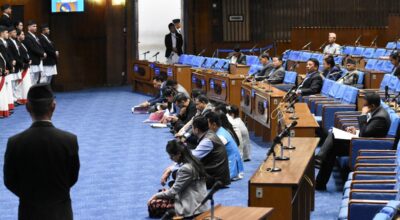 RSP lawmakers sit cross-legged in parliament, silently reading books in protest