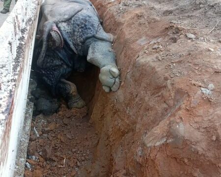 CHITWAN: A rhinoceros died after it fell into a trench created during the construction of