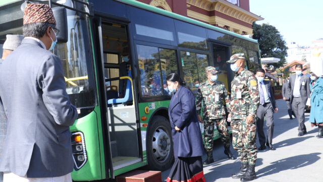 KATHMANDU: President Bidya Devi Bhandari today reached Patandhoka, Lalitpur in an electric Sajha bus. She