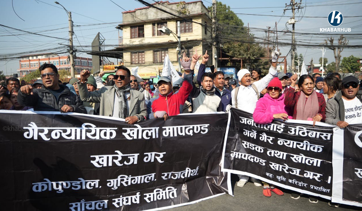 KATHMANDU: Residents living along roads and riverbanks in the Kathmandu Valley staged a protest today, demanding the repeal of existing river and stream regulations. The demonstration took place at Maitighar Mandala, where participants raised slogans and voiced their grievances. Protesters chanted slogans such as, “Give…
