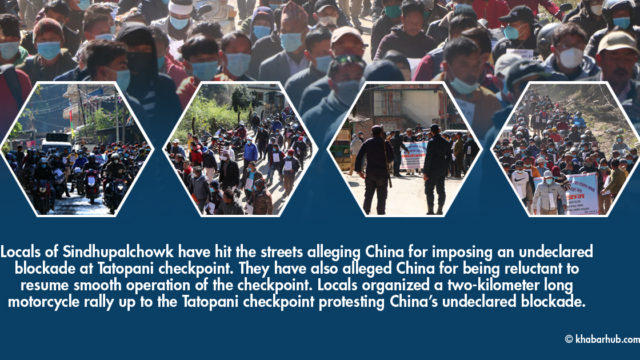 KATHMANDU: Locals have staged a protest against China at Tatopani checkpoint in Sindhupalchowk district bordering