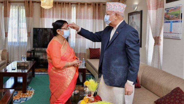 KATHMANDU: Prime Minister KP Sharma Oli offered ‘tika’ and ‘jamara’ to his spouse Radhika Shakya