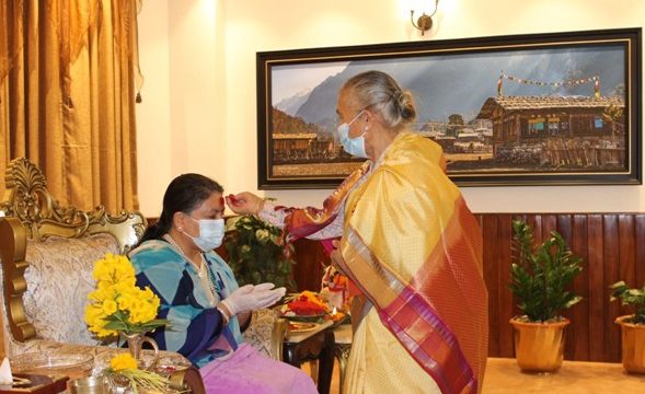 KATHMANDU: President Bidya Devi Bhandari today received Dashain ‘tika’ and ‘jamara’ from Guru Khem Chandra